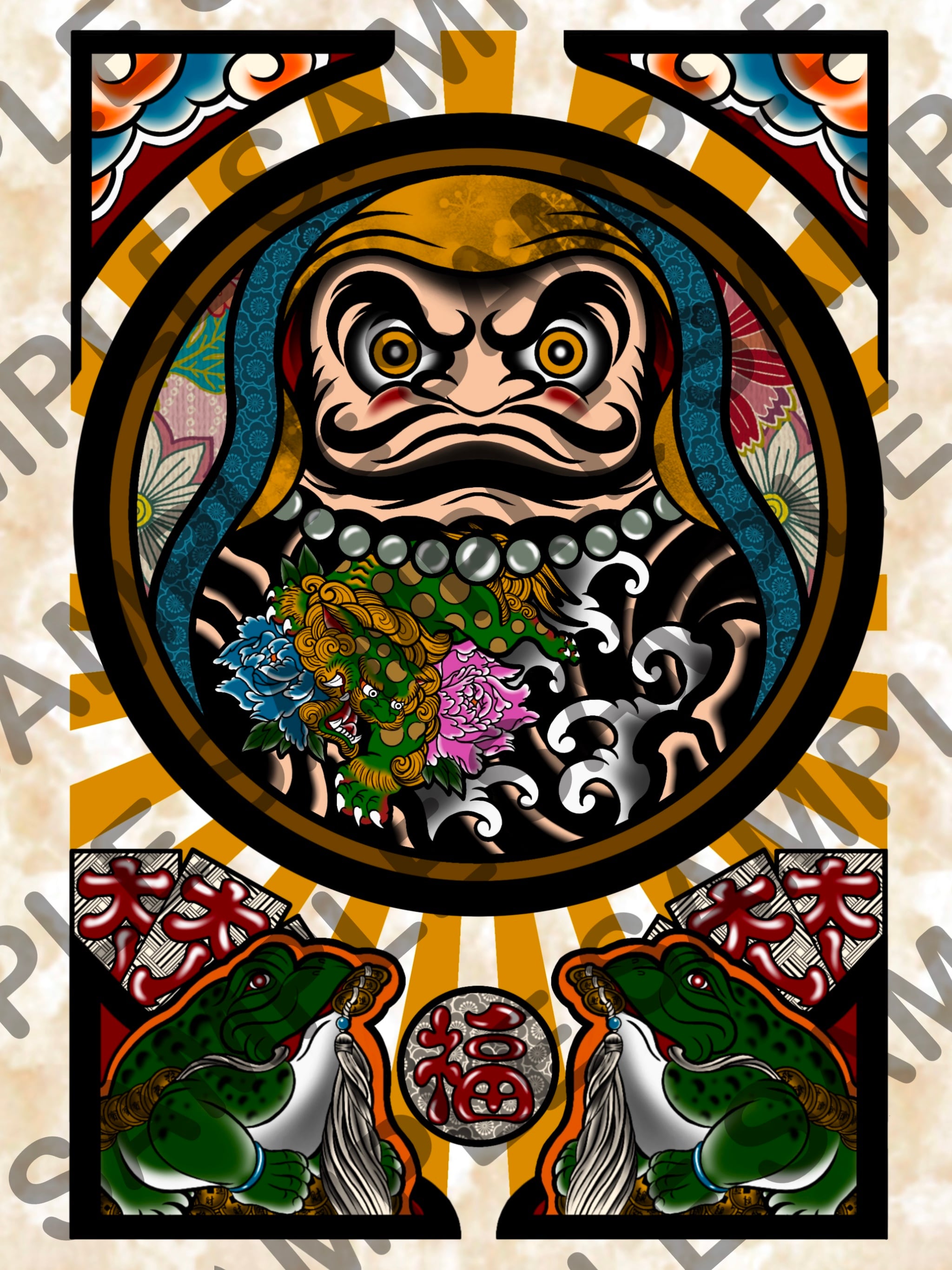 力強い唐獅子と華やかな牡丹を背負った“刺青達磨”の作品。